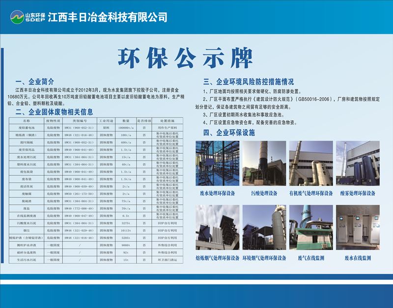 江西豐日冶金科技有限公司成立于2012年3月,注冊資金15000萬元,現(xiàn)為山東環(huán)保集團旗下控股子公司,落戶于江西省宜春市袁州醫(yī)藥工業(yè)園。公司年回收再生十萬噸廢舊鉛酸蓄電池項目占地62.41畝,總建筑面積42180㎡,總投資3.5億元,于2020年5月份投入生產(chǎn),自生產(chǎn)以來運行穩(wěn)定,年產(chǎn)值達10億元以上,年納稅1億元以上。